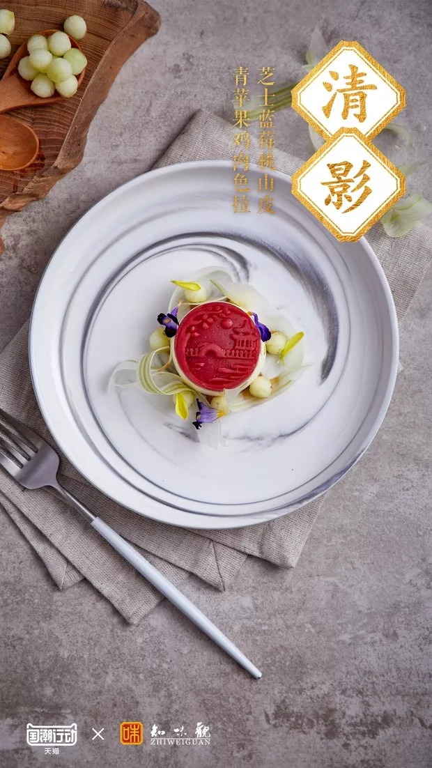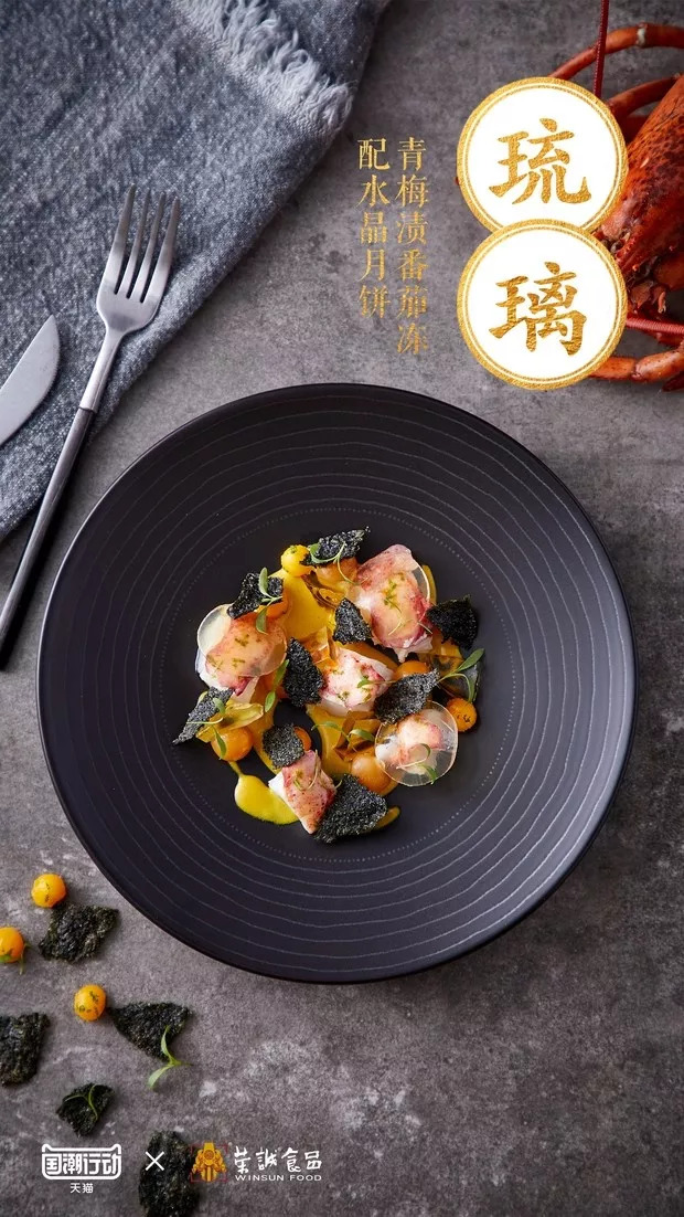 低温慢煮龙虾佐咖喱芒果酱、炭烤新西兰鲛鱼佐滇式火腿汁渍玫瑰 、树莓酱芝士蛋糕、莲子酱咸蛋和靼鞑、白巧克力椰慕斯配酱、煎鹅肝佐酒渍樱桃、抹茶液氮冰淇淋配小红豆奶油慕斯……你能想象这一组有着“琉璃、芳菲、琼楼、朱阁、清影、望月、夕月……”诗情画意的名字,却是以月饼为主食材的一道道高颜值的美味菜品吗?