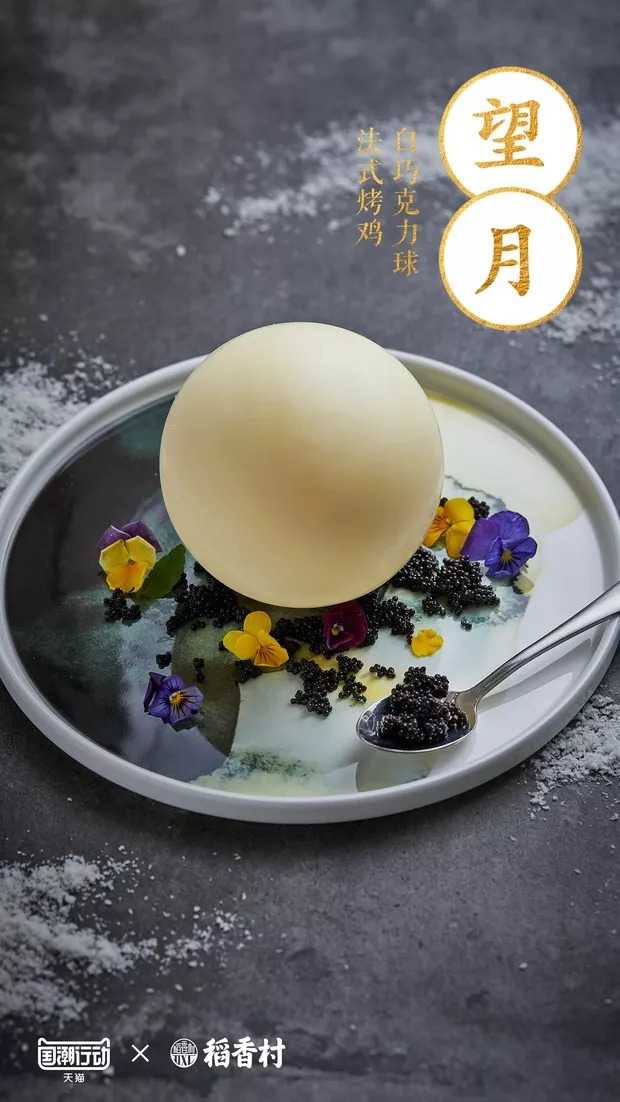 7大老字号月饼品牌(故宫食品、杏花楼、稻香村、知味观、五芳斋、嘉华、荣诚)开业前正式官宣,发布创意菜品海报,精致的摆盘让人垂涎欲滴,组合出的意境很国潮。「望月」品叔最爱的这例来说,稻花香将月球灯,定义为自己在新中秋时代送个食客的梦,而这个由白巧克力制成的甜食,与鱼子酱的搭配也是诱人。