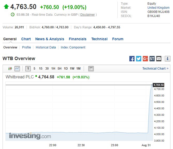 截止目前,Whitbread 在经纪商的盘前交易中已上涨了19%。