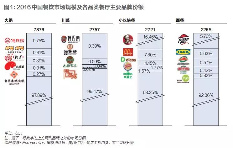 餐饮行业是一个品类分散且竞争异常激烈的行业。整个行业呈现显著长尾化,餐厅类型众多。《2017中国餐饮报告》显示,营业额占比在1%以上的有18个品类。其中,仅有火锅、自助餐、川菜、小吃快餐和西餐成为市场份额超过5%的品类。