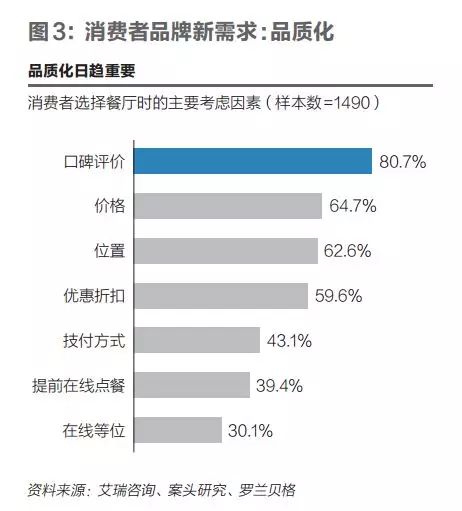 对于餐饮从业者而言,针对新型消费主体,需要在品牌层面更加用心。80后、90后消费者越来越重视餐厅品牌的品质。据艾瑞咨询消费者调研结果显示,餐厅的口碑评价成为消费者选择餐厅时最先考虑的因素,而口碑评价的背后则代表着消费者对品牌品质的诉求。