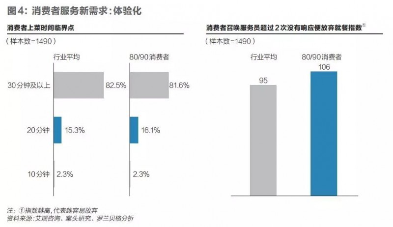 在餐饮市场,消费者的消费诉求逐渐从单一价格、质量转变为对环境、体验、服务的综合追求。80后、90后消费者对于餐厅服务的要求非常高,其中上菜效率和服务响应成为关键性因素。根据艾瑞咨询消费者调研结果显示,有近20%的消费者无法接受上菜时间超过20分钟,对于服务员响应的容忍程度,也明显低于平均水平。