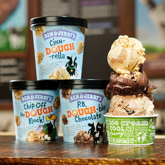 Ben&Jerry曾在1984年创造了第一款饼干冰淇淋,今年又推出了三种新口味,仅供门店使用。其中,Chip OffThe DOUGH Block! 配有巧克力片与巧克力饼干碎;P.B. DOUGH-ble Chocolate添加了花生酱和花生酱曲奇碎,搭配黑巧克力和牛奶巧克力冰淇淋;Cinn-DOUGH-rella肉桂和焦糖冰淇淋添加了奶油脆饼、肉桂和燕麦肉桂饼干碎。