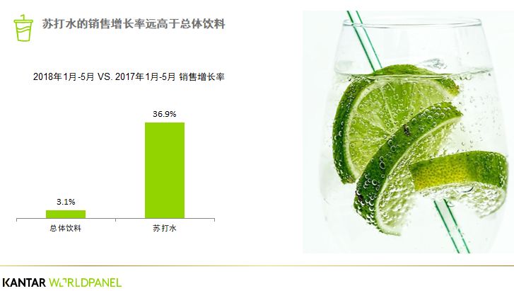根据凯度消费者家庭样组数据显示,就总体快速消费品市场而言,代表健康的品类,诸如豆奶,酸奶和麦片等近年来都属于高速增长的品类。苏打由于含有碳酸氢钠,呈现弱碱性,可以促进消化,增进食欲,美容肌肤等,因此符合大众对于健康的追求。