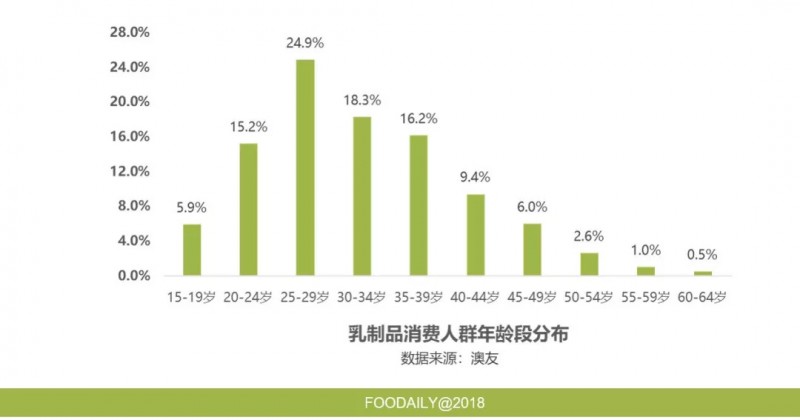 澳友数据显示,从中国消费人群的年龄段来看,乳制品消费集中在20-40岁,占总量的74.6%。其中25-29岁年龄段消费的乳制品占比最大,达到24.9%,他们作为主力的消费人群,既具有相当的经济实力,同时在品质和个性化上有自己的追求和喜好,也助推了乳制品的高端化进程。从消费频率来看,有30%的消费者每天至少都会饮用1次常温纯奶,38%的消费者每2-3天饮用一次常温纯奶,牛奶消费已经成为消费者饮食中重要组成部分。
