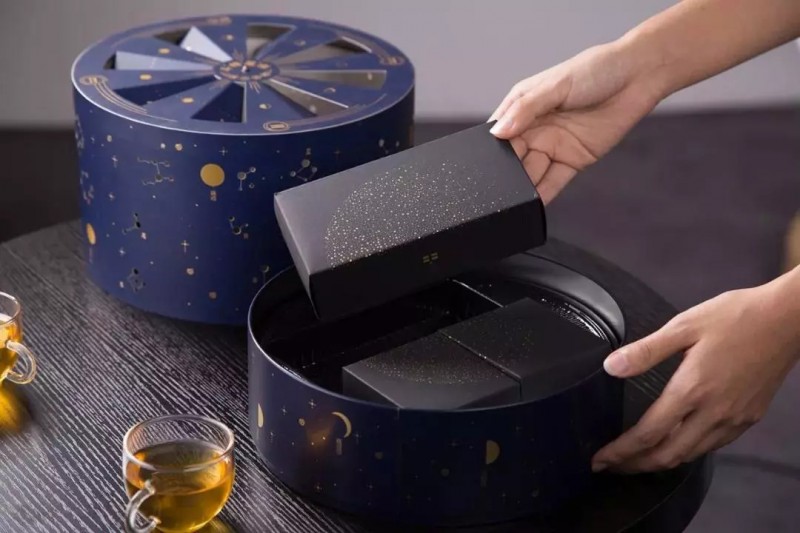 延续星辰皓月的创意升级,将月相变化、走马灯和中秋的月饼礼盒结合在一起,赋予月饼礼盒不一样的寓意。点燃蜡烛,盖上星光灯罩,在气流的助力下,盒子开始旋转,星宿月相映射而出……而月饼采用了黑色竹炭桃山皮工艺,呈现典雅的黑色,口感松润,不油不腻。
