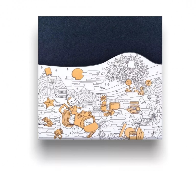 在越南文化中,中秋被认为是春节之外最重要的传统节日。包装上的图片描绘了一个热闹的中秋场景:从山峦到三角洲,从农村到城市,从传统到现代……丰富层次的细节展现了节日内涵。盒子是磁铁翻盖,还使用了金属银墨水,UV斑点消光和压花使其更加精致。
