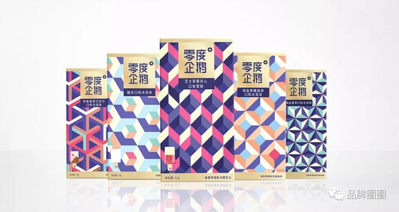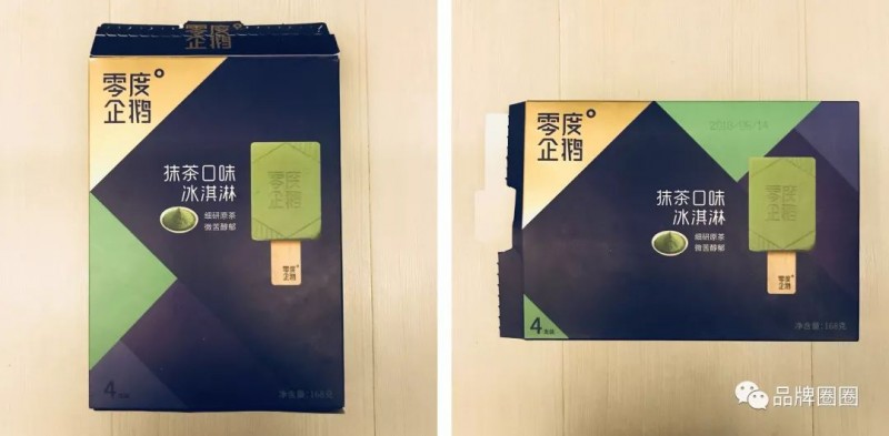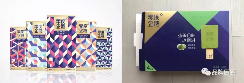 很明显——在线上的包装上,你几乎看不见产品的照片,整个画面都是漂亮的几何图形;而在线下的包装中,雪糕的照片就是构图的重点,非常突出。
