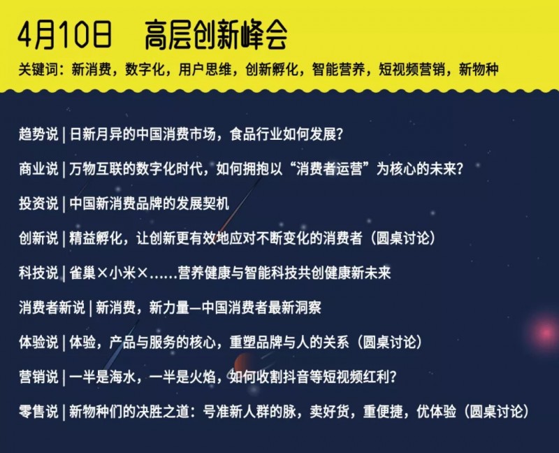 3)高层创新峰会:覆盖全产业链,从趋势、商业、投资、创新、消费者、设计/体验、科技、营销、新零售等全方位的大咖观点分享与讨论;