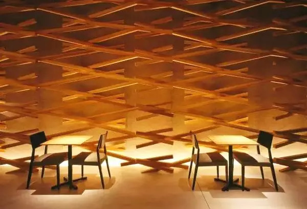 隈研吾非常擅长使用木材,该门店运用2000根木棍,长度1.3米到4米,截面6厘米见方木棍,木棍的总长度达到了4.4千米。