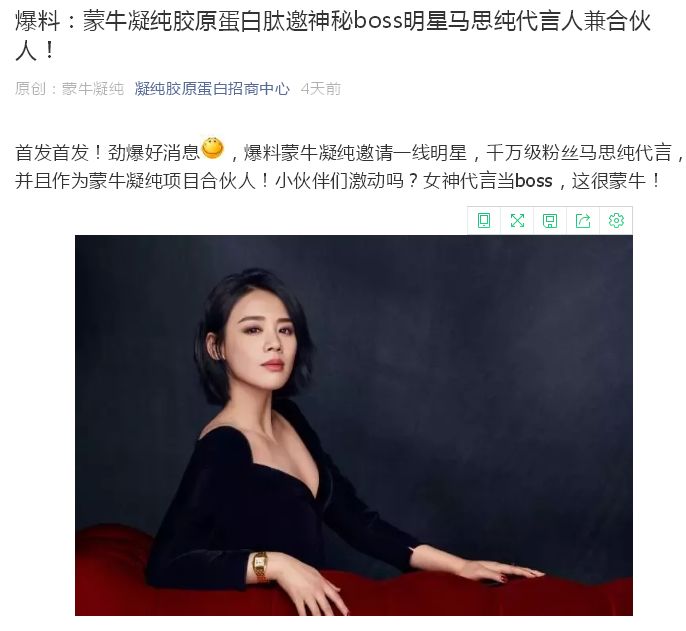 而且,有传言称:蒙牛凝纯胶原蛋白邀请马思纯为其代言人兼合伙人,也能看到这次蒙牛做社交电商的决心。
