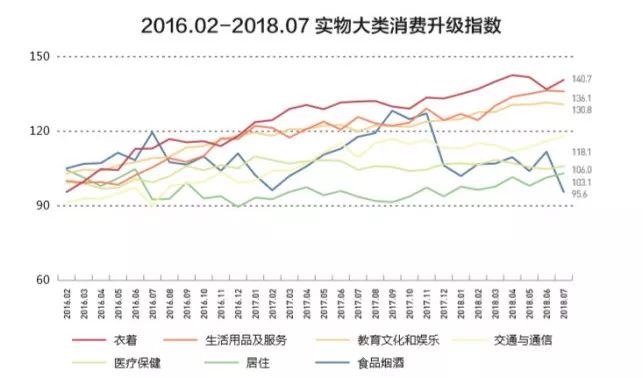 实物消费升级指数波动大,食品烟酒消费升级真的来了吗?:通过观察指数近两年的走势,实物消费升级指数已从两年前的100左右稳步上升至120以上,数据显示我国实物消费升级已经迈上新台阶,升级步伐保持稳健。但食品烟酒实物消费升级指数在近两年内波动较大,2017年呈现明显的消费升级现象,但从2017年11月实物消费升级指数滑铁卢般的下降后,一直持低,没有回升。