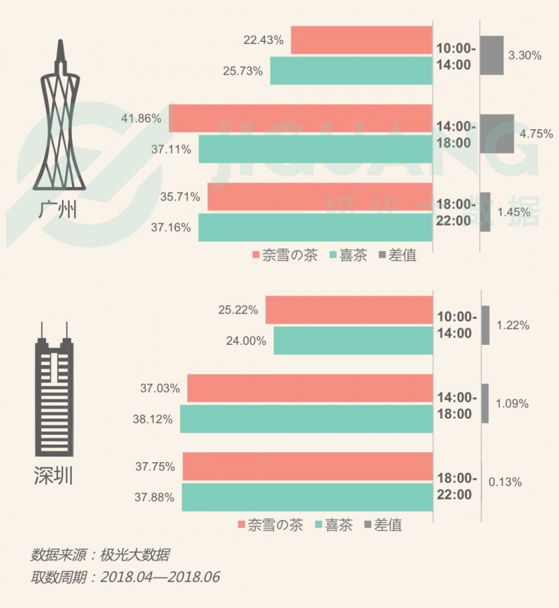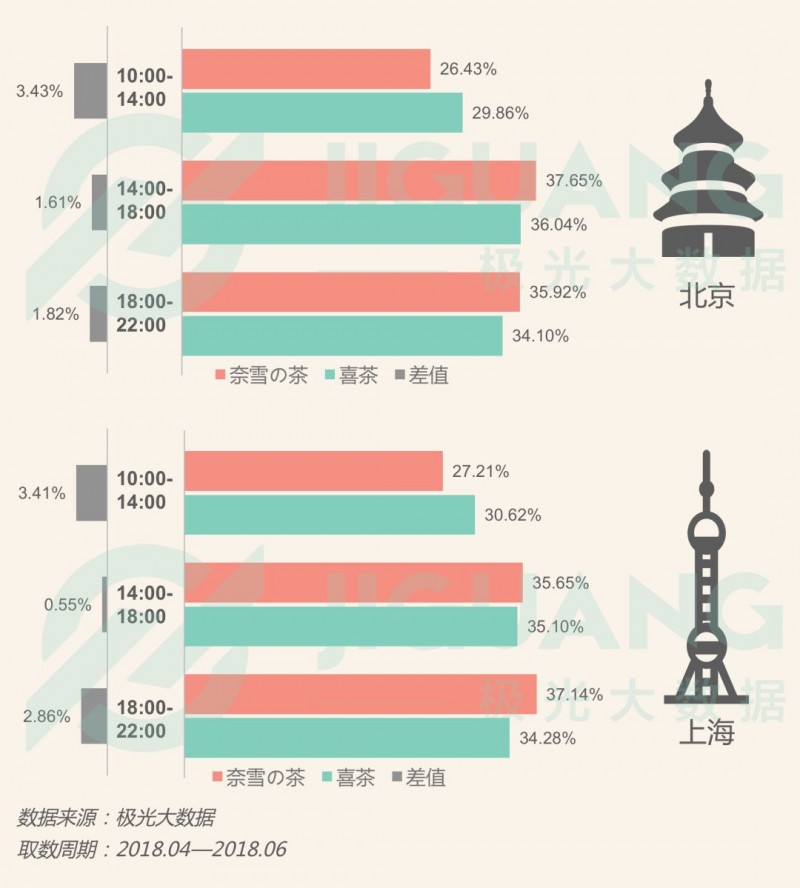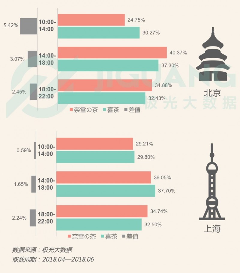 在北京和上海,喜茶人群更喜欢在快节奏的中午时段捎走一杯茶;而在悠闲自得的下午和繁忙一天后的晚上,奈雪の茶人群更喜欢品一杯茶