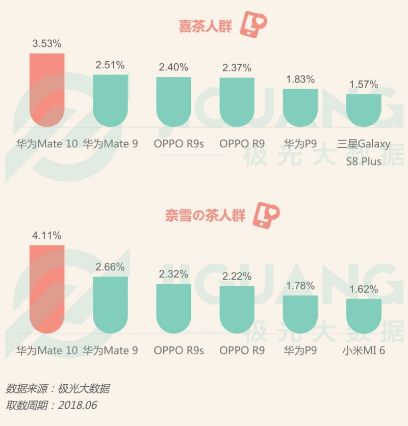 华为Mate 10和Mate 9机型最受喜茶&奈雪の茶人群欢迎