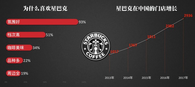 星巴克门店在中国增长的曲线非常快,几乎每年涨30%。在我们《2018新中产白皮书》前期的采访中,我们问大家为什么喜欢星巴克。几乎所有人都给出了同一个答案:气氛好,有档次。可见,气氛的重要性大于咖啡味道本身。