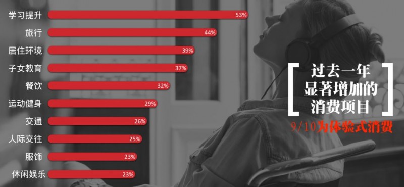 在我们的新中产调查中,新中产消费增加最显著的10个方面,只有1个是实物式商品,就是衣服。而且它的排名很低,已经在第九了,其余的9个都是体验式消费。其中,学习提升排在第一,旅行排在第二。