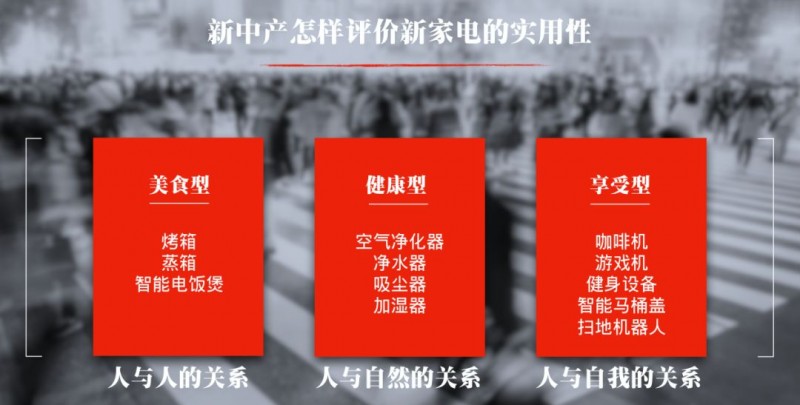 新中产在买家电时一定会追求实用性。实用性主要体现在优化人与人之间的关系,解决人与自然的关系,关怀人与自己的关系。
