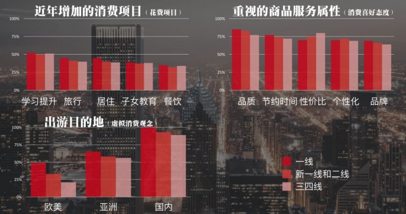 除了刚才说到的各个层级城市的新家电渗透率是差不多的之外,我们白皮书调查数据显示,新中产在花费项目、消费喜好态度和虚拟消费观念等方面,一二三线城市的水平也几乎是相同的。也就是说,城市之间的区别已经消失了。