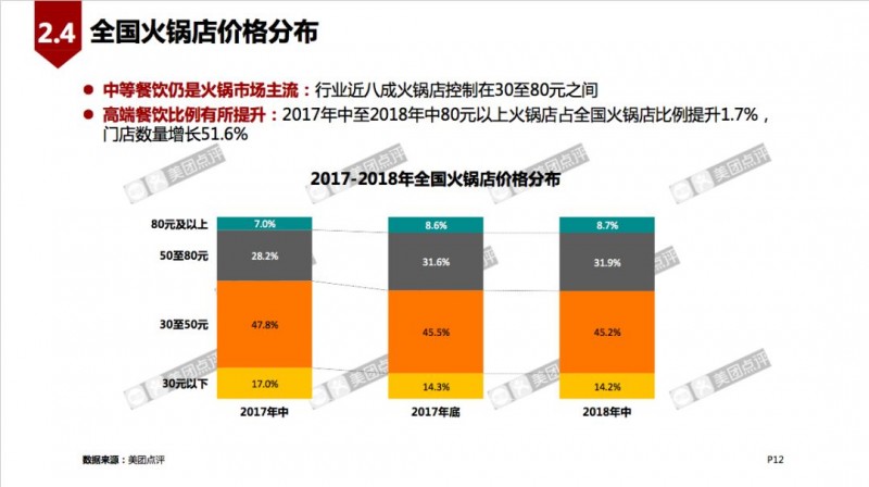 从2017年到2018年整体来看,30—50元、50—80元的火锅店价格,为火锅市场主流。