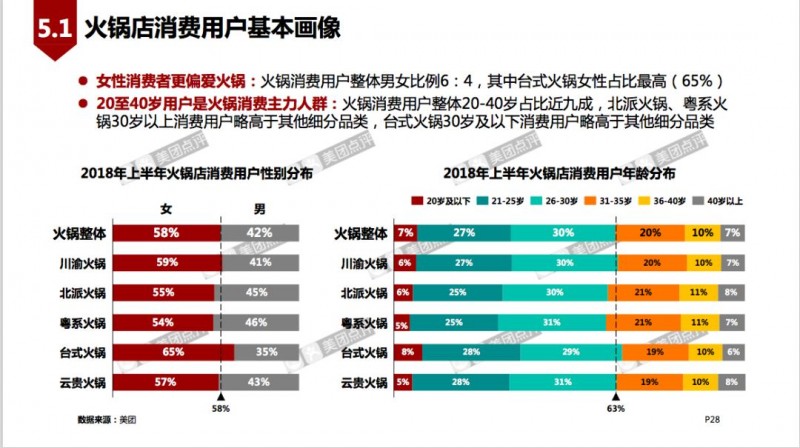 从2018年上半年火锅店消费用户性别分布来看,火锅整体的消费女性占58%,男性占42%。