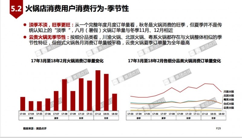 不太一样的是,台式火锅各月消费订单量较平稳,云贵火锅夏季订单量为全年最高。