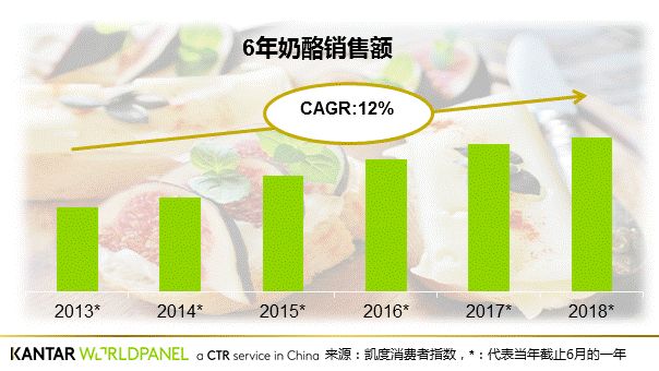 奶酪市场在最近几年的表现异常亮眼。凯度消费者指数家庭样组数据显示,截止2018年6月,奶酪市场近6年来的年均复合增长率达12%。随着越来越多的消费者喜爱奶酪的健康、其浓郁的口感和西式美食带来的生活体验,奶酪的渗透率也在快速增长,6年来增长30%。