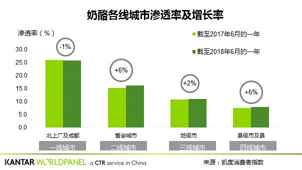 凯度消费者指数研究显示,奶酪渗透率将持续向下线城市转移。目前一线城市(北/上/广/成)仍保持着最高渗透率,需进一步发力。同时二、三四线城市的渗透率均在增长。相信随着人们生活质量水平的提高,以及冷链技术越来越成熟,奶酪的潮流将从一线城市辐射向下线城市,这将是各大厂家的机遇。