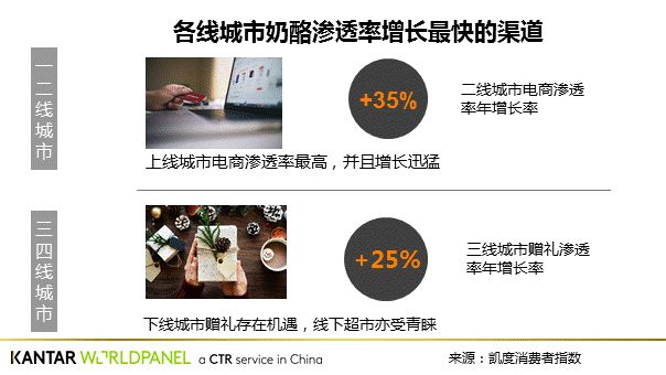 不同城市级别的消费者有着不同的生活诉求,因此在购买奶酪的渠道偏好上也有所不同。研究发现,随着一、二线城市消费者对即时性的需求增强,在电商渠道购买奶酪的消费者越来越多。其中,截至2018年6月的一年同期对比,二线城市消费者在电商渠道购买奶酪的渗透率增长了35%。对于生活在三、四线城市的消费者也将奶酪作为送礼的选择之一,因此奶酪在送礼渠道增长迅速。