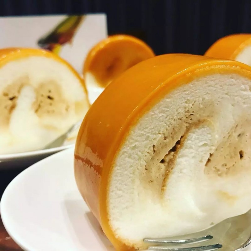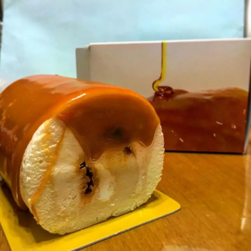 蓬松的海绵蛋糕裹入夹杂着焦糖酱的奶油