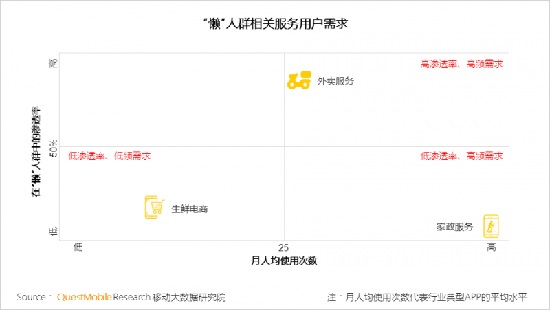 1、“懒”人群对外卖服务、家政服务的需求频率较高,生鲜电商则相对较低
