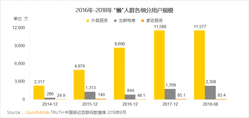 3、外卖服务和家政服务带动的“懒”人群的增长已趋缓,生鲜电商用户仍在增长,总体来说,“懒”人群对外送服务的需求显著高于上门服务。