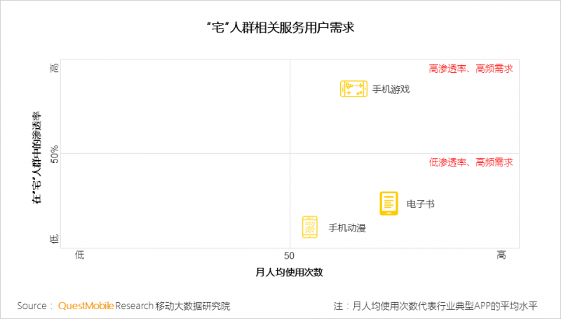 1、“宅”人群对手机游戏、电子书、手机动漫的需求频率均较高