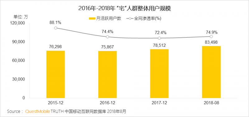 2、“宅”人群整体用户规模突破8亿,呈稳定增长趋势