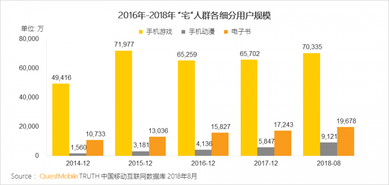 “宅经济”中,宅文化向30岁以上人群蔓延,手机游戏用户增长了1800万、电子书用户增长了1400万,同时,动漫、短视频则大量吸引年轻关注,过去一年,24岁以下动漫用户增加了1200万,超过5成B站用户刷起了抖音……