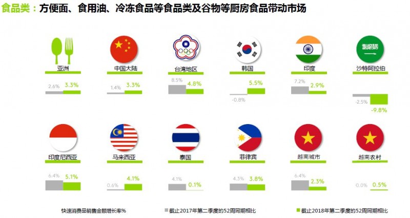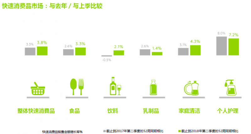 2018年第二季亚洲快速消费品市场销售额增长率达3.8%,整体市场发展前景乐观。其中,家庭清洁和个人护理两大品类为主要增长驱动力。
