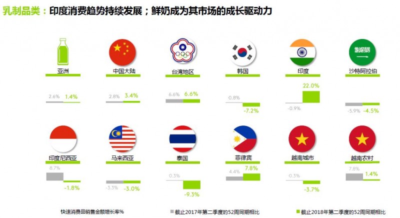 乳品市场从2017年2.6%的增速在2季度下降到1.4%, 而印度市场依然保持可观的增速,增长机会主要集中在鲜奶品类。