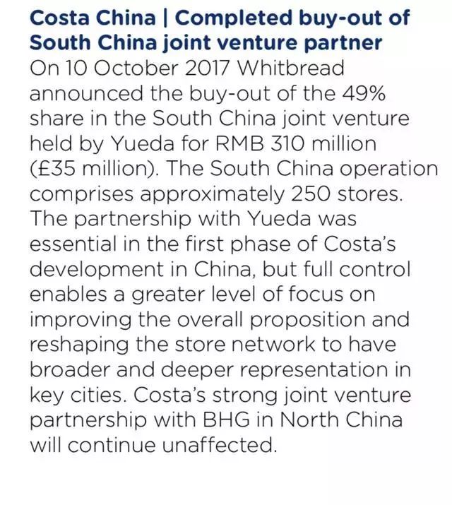 据英国《金融时报》报道,今年4月25号的报道,Costa咖啡的母公司英国Whitbread将旗下酒店品牌Premier Inn与咖啡连锁品牌Costa分拆为两家独立公司,可见今天的并购做了充足的准备。在此之前,Costa收购了中国南方市场的合资经营权,北方的BHG的合资计划不受影响。