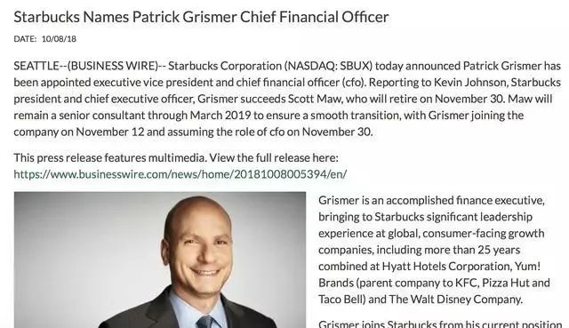 星巴克与雀巢的联姻是被迫的,舒尔茨走后星巴克马上业绩下滑,中国市场的宏伟目标6000家门店面临着巨大压力,中国咖啡的领头羊被对手各个角度PK,星巴克的日子很不好过。就在10月10号星巴克公司(Starbucks Corporation, NASDAQ: SBUX)宣布任命Patrick Grismer为执行副总裁兼首席财务官。