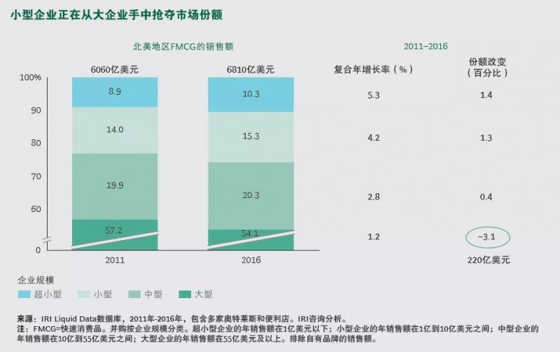 过去50年,跨国消费品企业强化品牌、扩展产品组合、稳步提高市场占有率和收入,创造了强大的股东价值。那曾是大媒体、大零售商、大品牌的时代。大约五年前,规模较小的企业和品牌首次开始瓜分大品牌的蛋糕。在2011年到2016年间,北美地区大约220亿美元的行业销售从大企业转移到小企业。欧洲也经历了同样的改变。