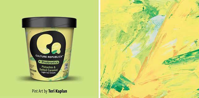 这款冰淇淋中含有真正的开心果碎,与咸焦糖完美融合。包装是由来自纽约的内容创意总监Teri Kaplan Trigalo而打造,她出生于南非,一直通过绘画搞创作,后来受周围环境的启发开始创作大型的抽象作品。