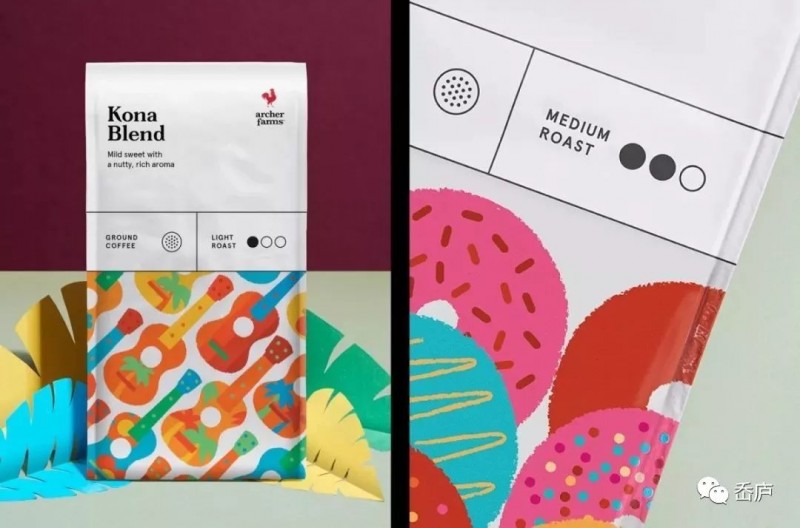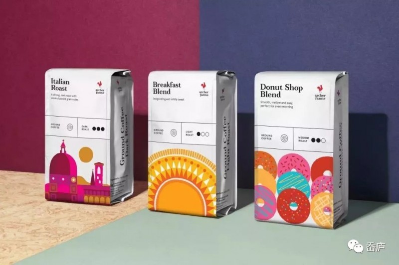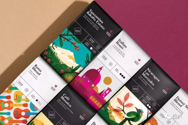这是我很喜欢的一个系列。这款视觉醒目惊艳的咖啡包装来自Archer Farms。用卡通插图和生动的颜色,与其它咖啡包装区别开来。不同产地的咖啡豆,采用不同的图案与颜色,故事性极强,令人印象深刻。