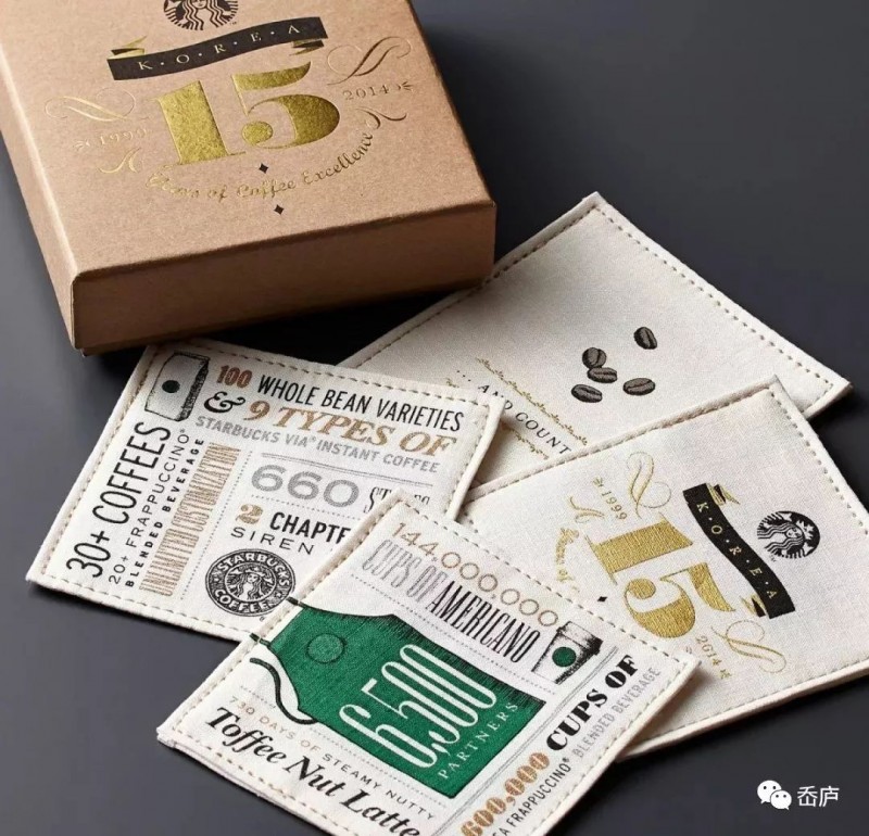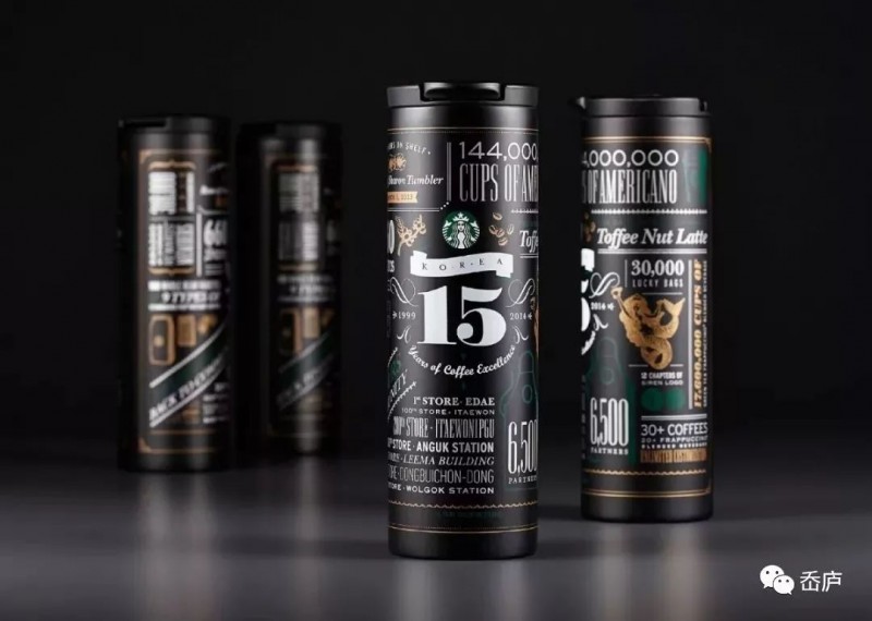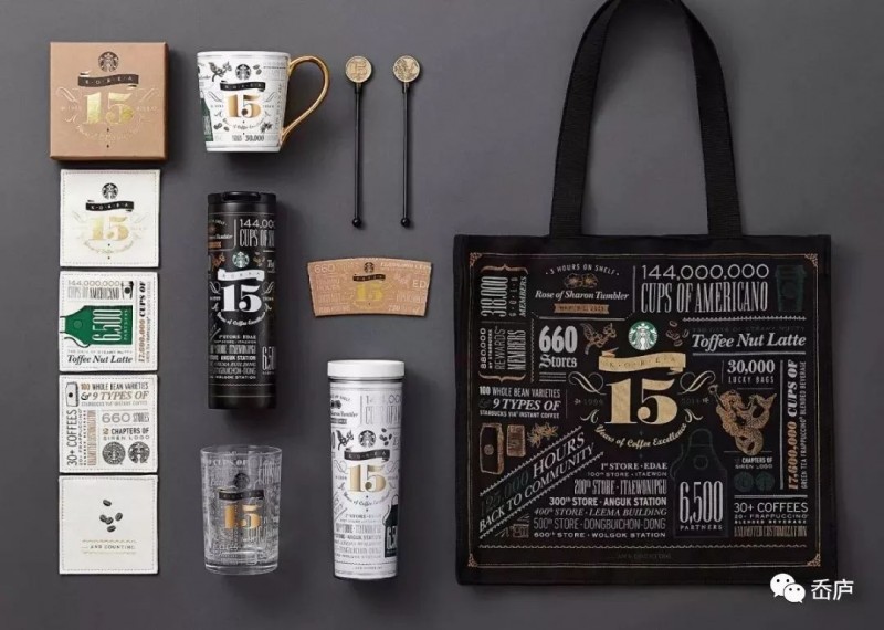 在星巴克进入韩国市场15周年期间,推出的这组主题纪念套装,以老式咖啡包装为基调,以数字为故事主线,巧妙的把星巴克历史串联在一起,获得了与消费者的感情共鸣。(不管你是不是星巴克的粉丝,不得不说它的产品包装颜值始终在线。)