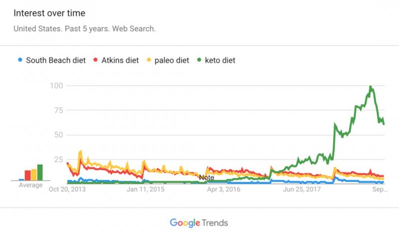 在时下所有低碳水饮食领域中,又以主打“低碳水、高脂肪”的生酮饮食(Keto Diet)最为热门。Google Trends的数据显示,过去五年中,用Google引擎搜索“生酮饮食”的人数在2018年发生了爆炸式增长,相比之下,其他诸如“南海滩饮食”、“阿金斯饮食”、“原始人饮食”之类的低碳水饮食类目,搜索量则一直保持平稳。