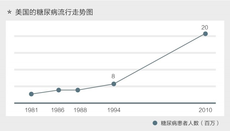 根据美国农业资料显示,美国每人每年糖分摄取量在1850年时平均才9公斤,但到了1960年时,每人每年平均摄取量已经高达50公斤,到了2010年的时候,已经增长到70公斤。这还只是算了添加糖,并不包含食物本身含有的糖。