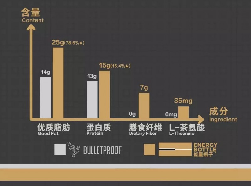 能量瓶子从筹备到研发总投入成本超过100万,产品的营养比例从多个维度都超越了国外品牌Bulletproof。