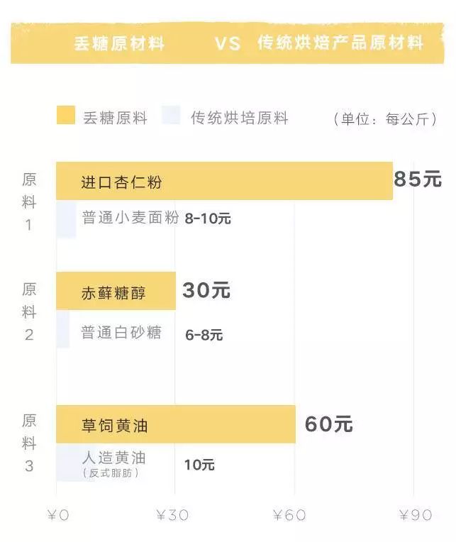 为了让每个人都能在日常的生活中无负担的享用甜品,「丢糖」系列产品的所有原材料,用的都是传统烘焙行业很少会使用的昂贵原料。比如,用赤藓糖醇代替了传统甜品里的白砂糖,这种天然的甜味成分不参与代谢,0热量,但它的成本是白砂糖的4-5倍。而用来代替普通小麦面粉的杏仁粉,碳水含量大幅降低并且不含麸质不致敏,但相对应的,这一原料的成本也上涨了8-10倍。还有草饲黄油的成本,也是传统烘焙产品用的人造黄油/氢化植物油的6倍以上。