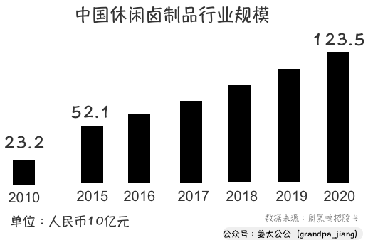 2010年到2020年,10年的时间,中国卤制品行业规模翻了6倍。绝味鸭脖无疑成为了最大的受益者。