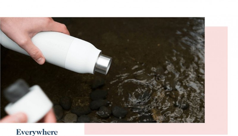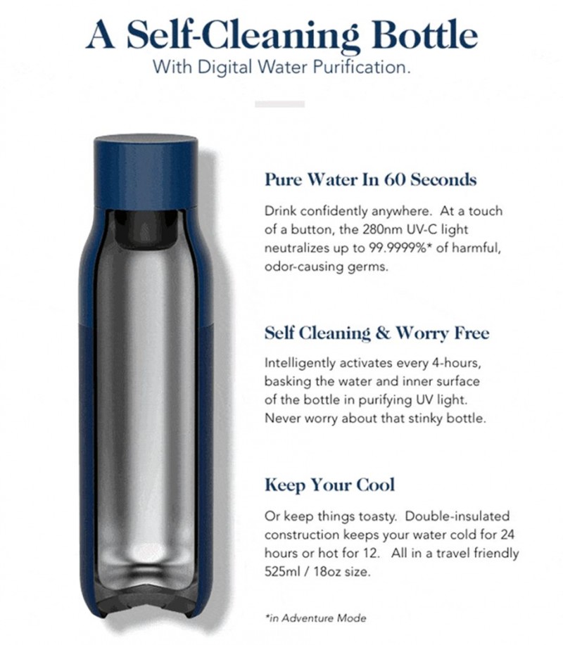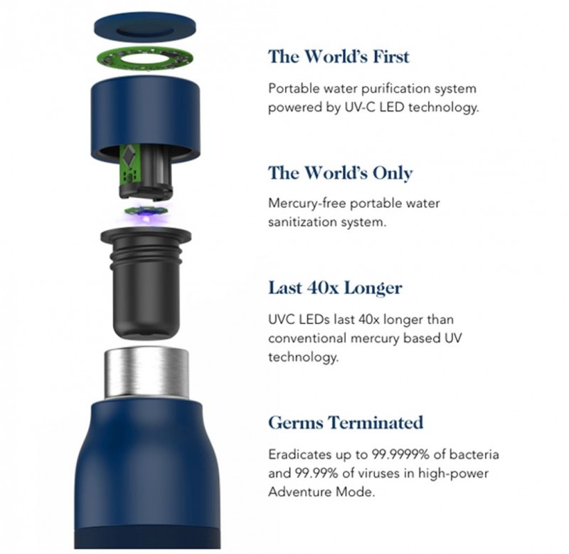 这款产品具有世界上首款采用UV-C LED专利技术的便携式净化水系统,通过光化学反应去除99.9999%的有害细菌和99.99%的病毒,只需按一下瓶盖上方的按钮,即可启动紫外线净化装置,瓶中的水就可以在60s内实现净化消毒。
