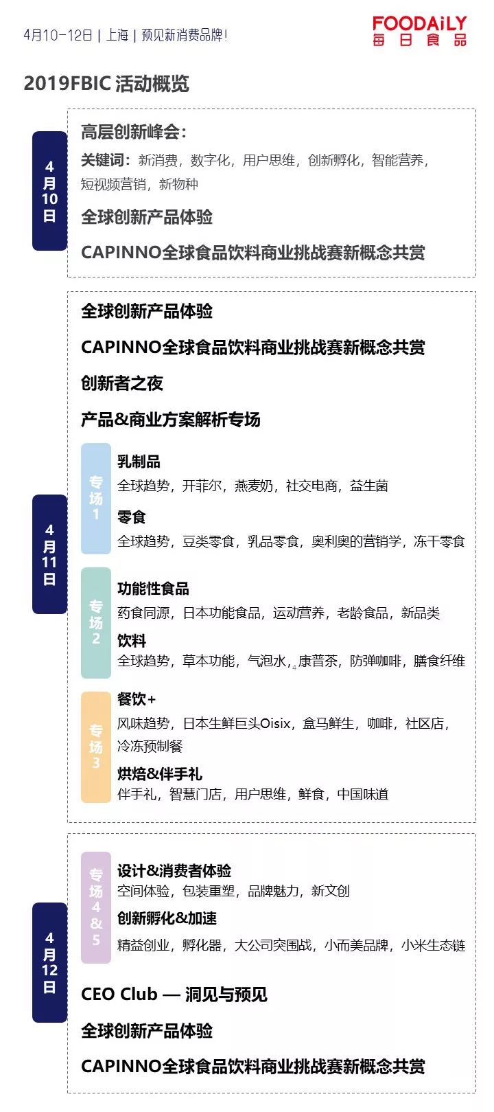 除了乳品、饮料、功能性食品、零食、餐饮+、烘焙&伴手礼等6个品类专场之外,2019FBIC新增设计&消费者体验,创新孵化&加速2个专场,将分别探讨: