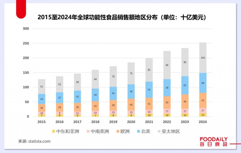 首先从整体市场规模来看,英国市场研究机构Statista对全球功能性食品2015-2024年销售额进行了统计和预测。从图中可见,亚太在增速和绝对量上均超过北美。但细分到单个国家,仍然是美国一枝独秀。美国功能食品市场销售额在全球中的占比始终保持30%以上。